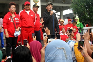 KUNINGAN - Calon Gubernur Jabar 2013 dari PDI Perjuangan Rieke Diah Pitaloka alias Oneng (kanan) didampingi Bupati Kuningan H Aang Hamid Suganda (tengah) dan Istri Bupati Kuningan Hj Utje Choeriah Suganda (kiri) memimpin senam pagi sekaligus sosialisasi Rieke Diah Pitaloka sebagai Calon Gubernur Jawa Barat pada acara Car Free Day (CFD) di Jalan Siliwangi depan Pendopo Kabupaten Kuningan, Minggu (2/12/2012). Rieke Diah Pitaloka menyapa dan meminta doa restu kepada ribuan masyarakat Kabupaten Kuningan dalam rangka sosialisasi pencalonannya sebagai Gubernur Jawa Barat periode 2013-2018. Selanjutnya Calon Gubernur Jawa Barat Rieke Diah Pitaloka melanjutkan perjalanannya dengan berjalan kaki ke taman Kota Kuningan. Kelak jika menang di Pilgub nanti, Rieke Diah Pitaloka akan membuktikan bahwa dirinya bisa membangun dan mensejahterakan masyarakat Jawa Barat, sudah saatnya kedepan Jawa Barat dipimpin oleh kaum wanita. BNP/Handy Ramadhan.
