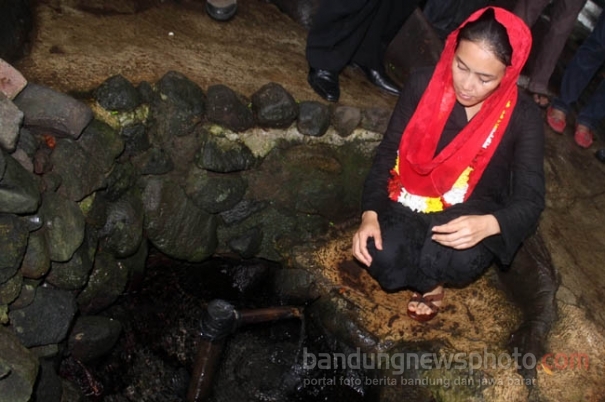 KUNINGAN - Calon Gubernur Jawa Barat 2012 dari PDI Perjuangan Rieke Diah Pitaloka melakukan ziarah ke Sumur Tujuh saat mengunjungi obyek wisata Cibulan di Desa Manis Kidul, Kecamatan Jalaksana, Kabupaten Kuningan, Minggu (2/12/2012). Rieke Diah Pitaloka mengunjungi satu per satu sumur yang merupakan tempat patilasan Prabu Siliwangi pada zaman penyebaran Islam di Kuningan dahulu. Kunjungan ke Cibulan dan Sumur Tujuh ini masih dalam rangkaiannya mengunjungi Kabupaten Kuningan untuk sosialisasi pencalonannya sebagai Gubernur Jawa Barat periode 2013-2018. BNP/ Handy Ramadhan