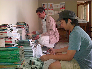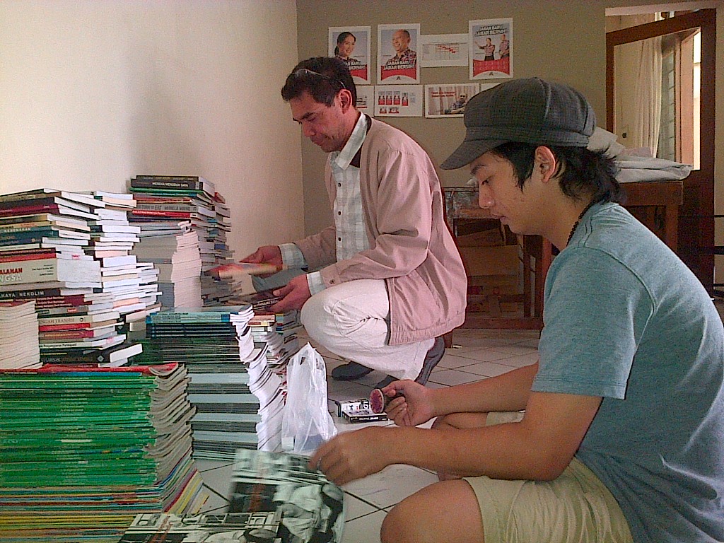 Syaeful Rohman (kanan) seorang staf Teten Masduki, sedang memilah buku untuk program 'Buku Saba Desa' di sebuah ruangan di Jalan Pudak No 21, Bandung.