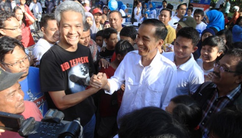 SOLO, KOMPAS.com - Gubernur DKI Jakarta Joko Widodo menyatakan dukungan penuh terhadap salah satu calon gubernur Jawa Tengah, Ganjar Pranowo, saat bertemu di acara car free day di Solo, Minggu (17/3/2013). Kehadiran Jokowi dan Ganjar di acara yang dipadati warga Solo di sepanjang Jalan Slamet Riyadi pun menarik perhatian warga Solo.