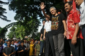 SEMARANG, berita21.com – Calon Gubernur Jeteng, Ganjar Pranowo, Kamis (25/4) melakukan pencabutan serta penertiban atribut gambar pasangan calon Ganjar-Heru yang dipasang pohon-pohon di ruas Jalan Simongan Raya, Semarang.