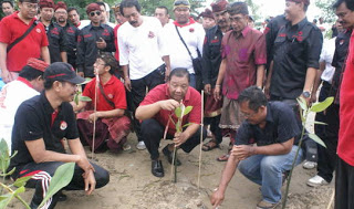 DENPASAR–Calon gubernur Bali Puspayoga menanam pohon mangrove dalam acara sosialisasi Paket PAS dalam Pilkada 2013 di Sanur, Minggu (31/3/2013).